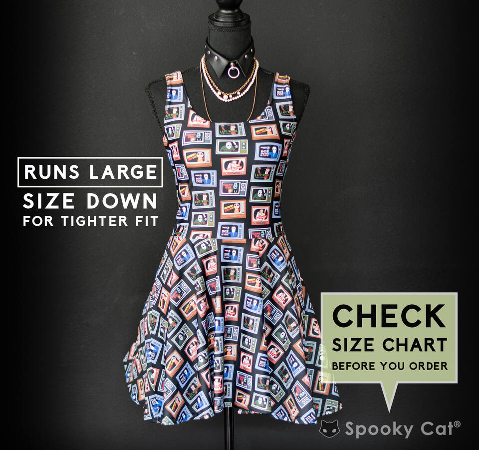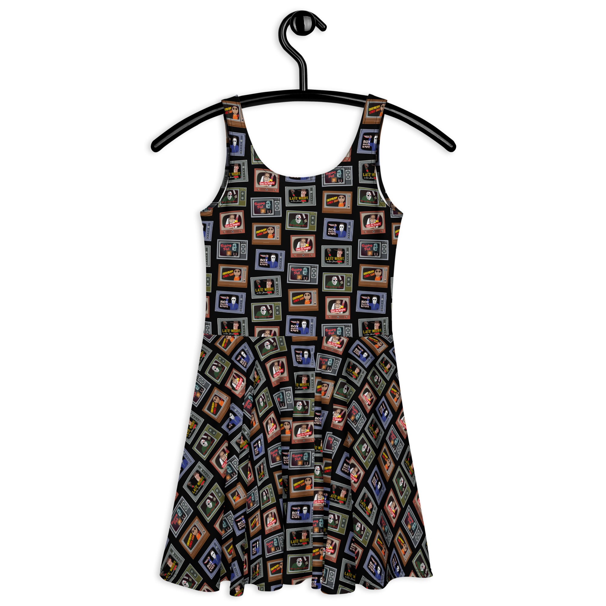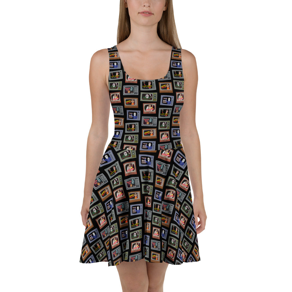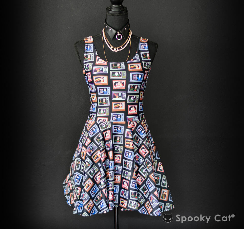 What better way to binge your favorite fright flicks than in this Horror TV Dress? Covered in retro TV screens playing creepy classics, this silky, flowy fit & flare skater dress is flattering on everyone. Pair it with a leather jacket for a night out or layer it over a long sleeve for a cozy horror marathon. Stylish, effortless, and comfortable—this spooky statement piece is perfect from Halloween season through every horror-filled night of the year.