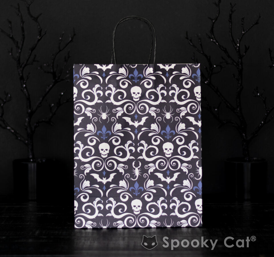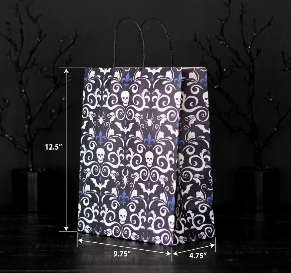 Our signature Gothic Damask print is now available in this premium paper gift bag. Perfect for spooky birthdays, gothic weddings, or any occasion that calls for a little dark elegance.