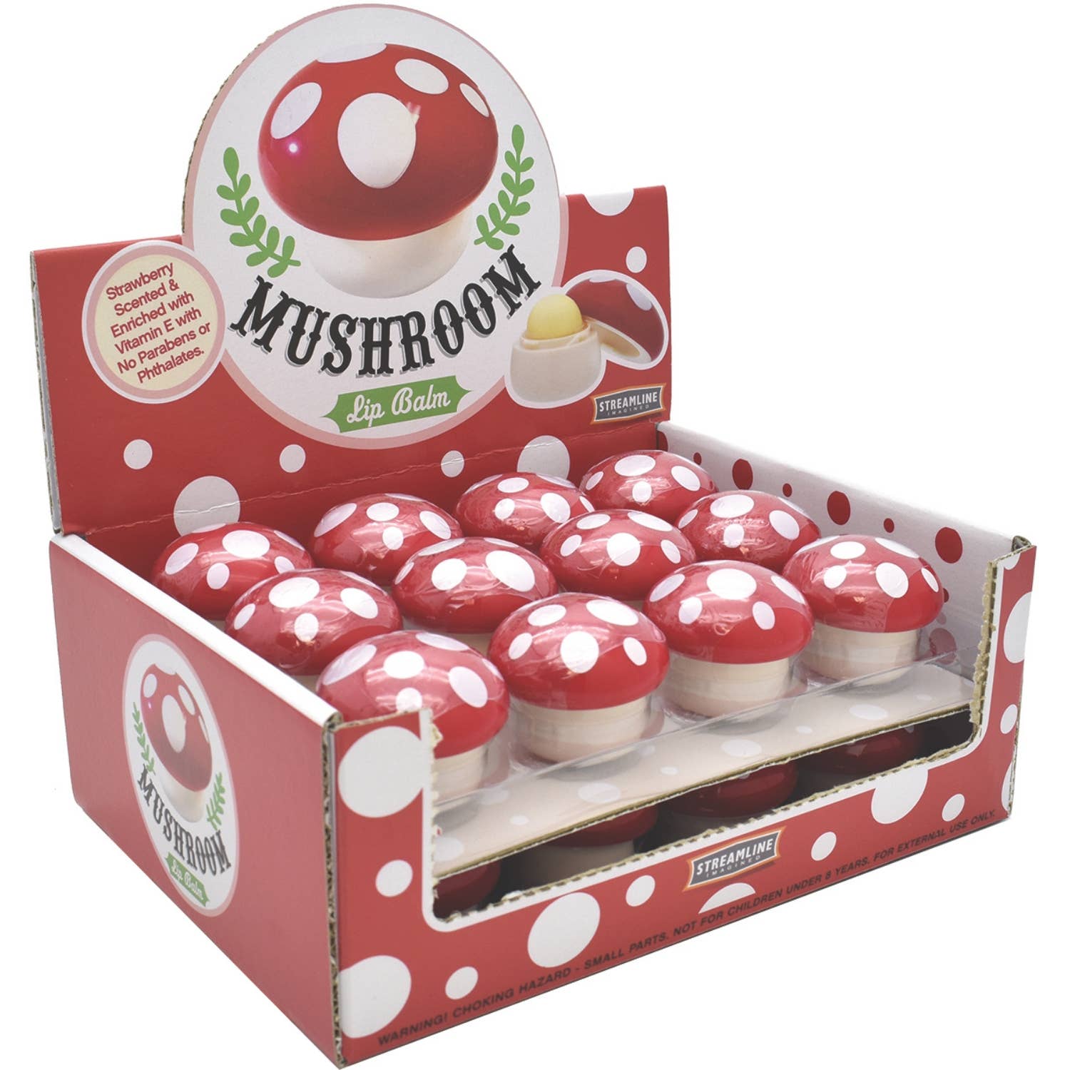 A perfectly pocket sized lip balm in the shape of an adorable mushroom. Vanilla flavored, phthalate and paraben free, this cute mushroom lip balm is the perfect cosmetic to keep your lips fresh and smooth! Apply directly to lips, wearing it alone or under lipstick to give your lips an extra layer of moisture and softness. The packaging is pocket sized for easy transport, and makes the perfect gift for birthday, special occasion, holiday, Mother's Day and even Father's Day! Mushroom lip balm makes a great stocking stuffer or party favor, and a "must have" for the mushroom lover!