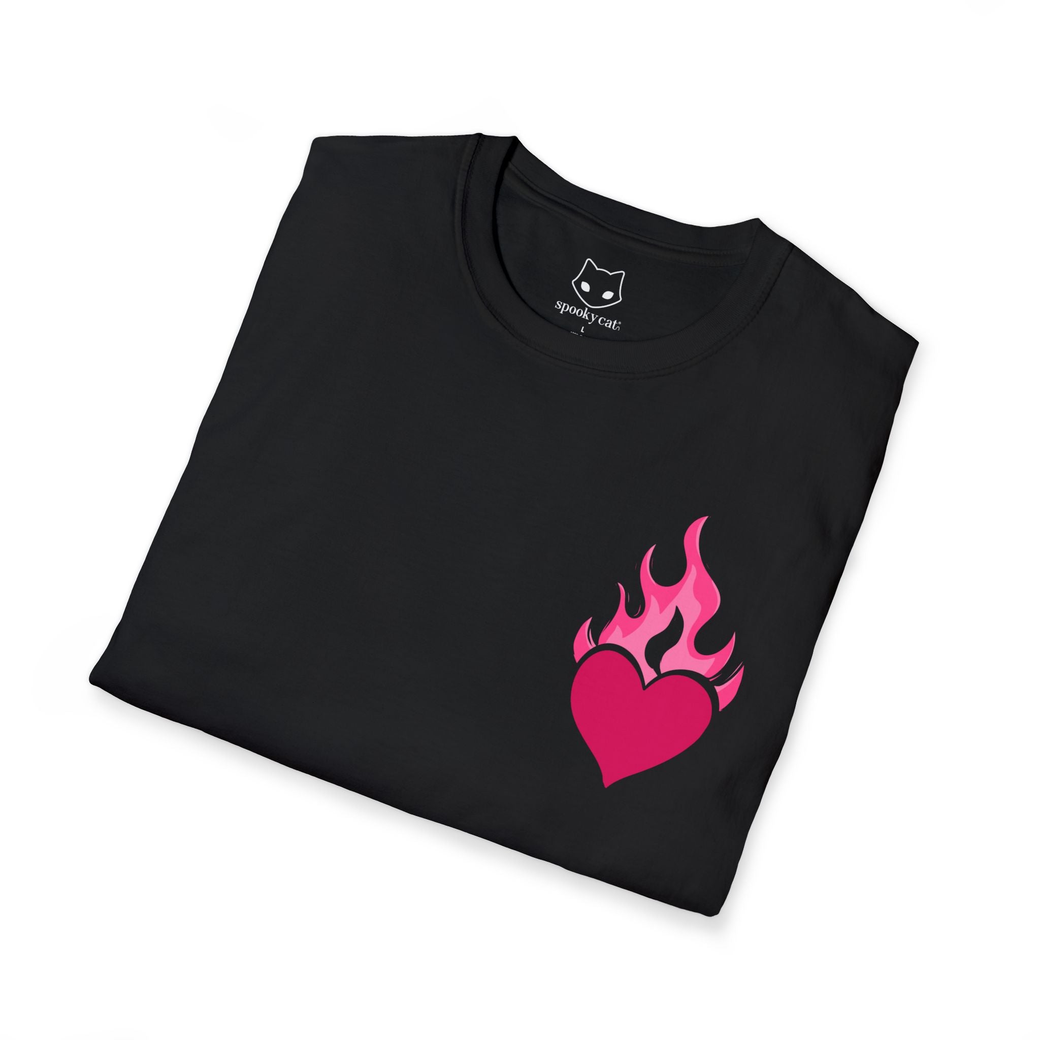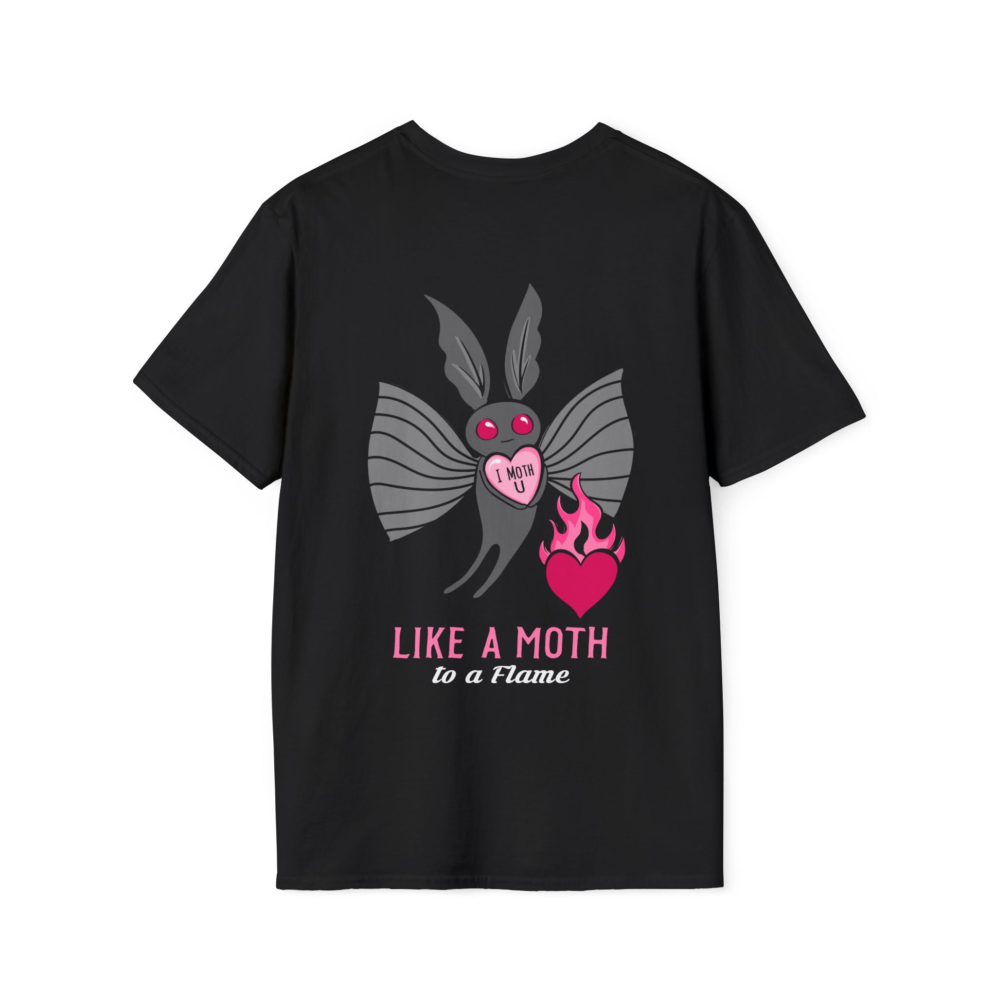 Like a Moth(man) to a flame, she follows her heart. This Mothman t-shirt showcases a cute comic mothma’am, heart in hand, floating happily toward the flame. Printed from and back, you'll love how you feel in your new favorite shirt.