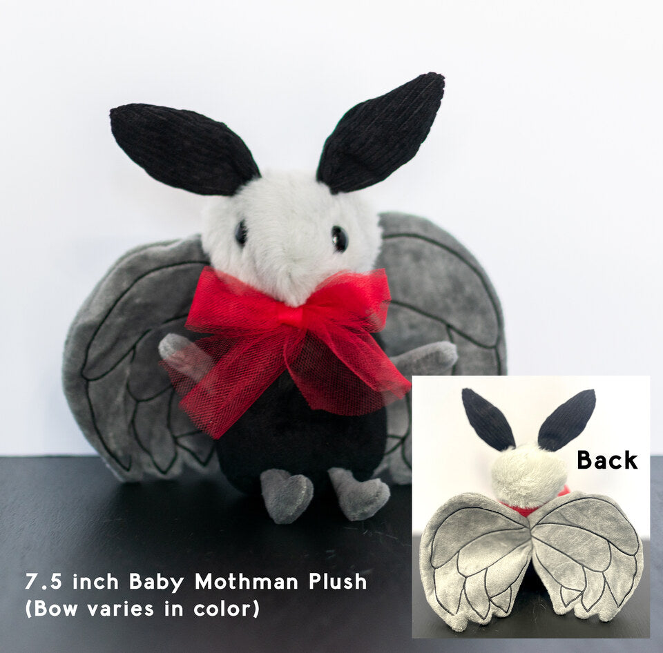 An adorable fuzzy little Baby Mothman Plushie, perfect for a Valloween gift.