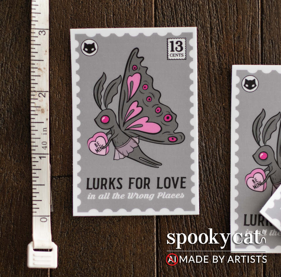 Add a touch of spooky romance with this Lurks for Love Vinyl Diecut Sticker, featuring a heart-accented Mothman design with playful Valloween charm.