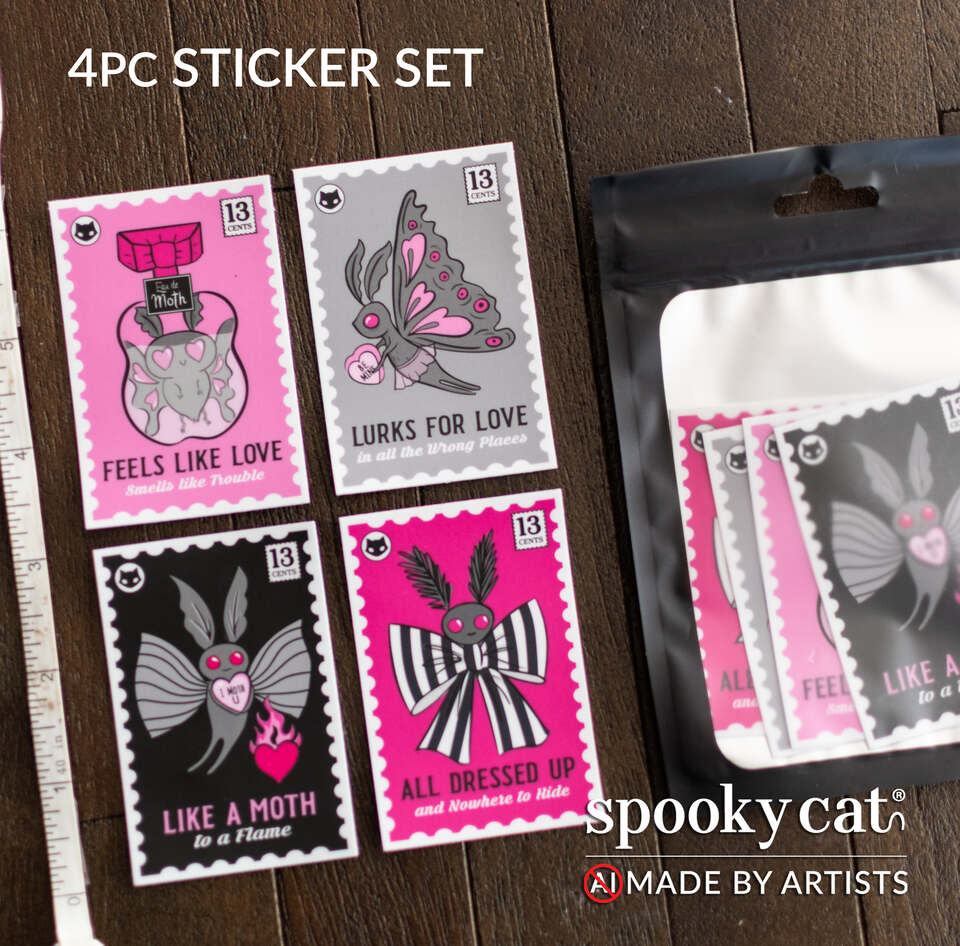 Celebrate spooky love with this Mothman Valloween Vinyl Sticker Set, featuring multiple Mothman designs inspired by gothic Valentine themes.