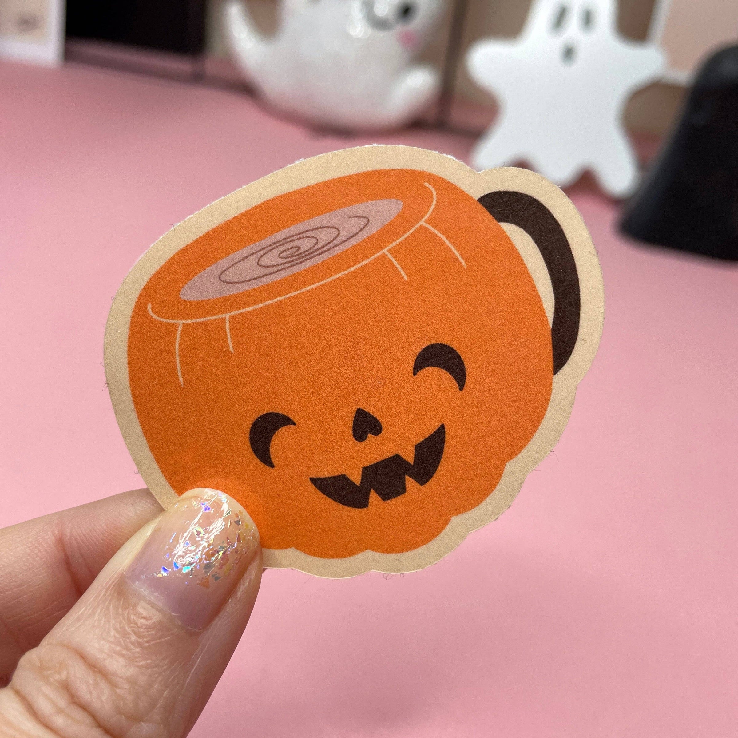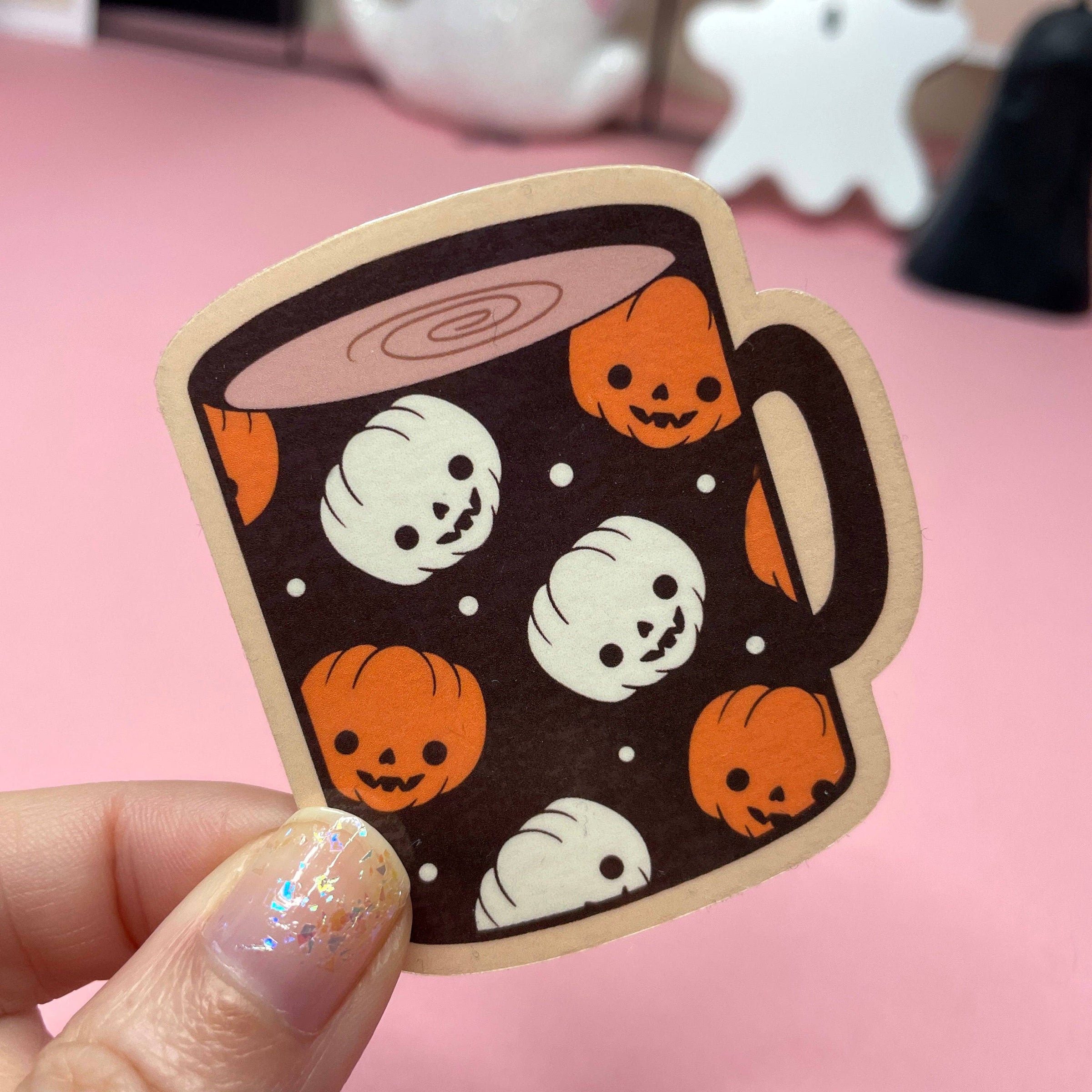 Spooky Coffee Mugs Stickers: Pumpkin Mugs, Cute Cat in Teacup Vinyl Sticker