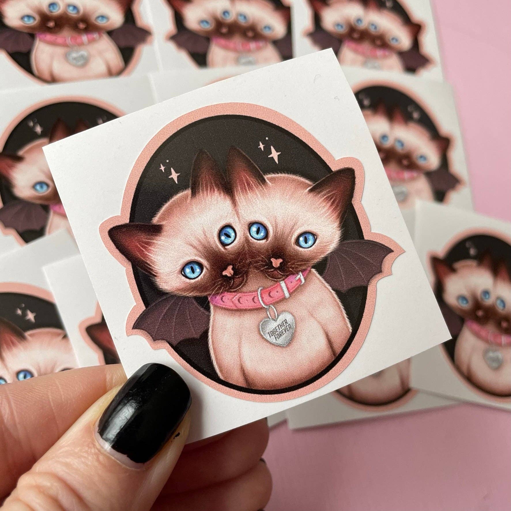 A spooky die cut waterproof vinyl sticker of my original illustration of a Two Headed Siamese Cat. These cute little Siamese bat cat twins are wearing a heart shaped collar that says 'Together Forever'. Ideal for cat and kitten lovers.