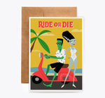 It's ride or die for Frankenstein and Bride. It's time to hit the road and your favorite Tiki haunts with this Summerween card. It's the perfect card for a tiki anniversary for those monsters who were made for each other.
