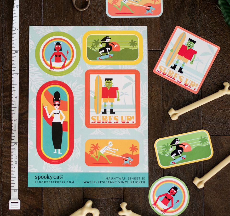 Frankenstein and Bride take a little vacay in this retro-themed Tiki sticker sheet. These kitschy travel stamps are so cute on a vintage train case or suitcase. (Sheet B) *COLLECT ALL THREE SHEETS*