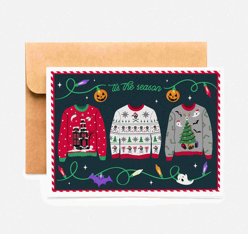 'Tis the season cozy Creepmas Sweaters and send your warmest greetings with this new classic goth Christmas card. We rock our Halloween style all year!